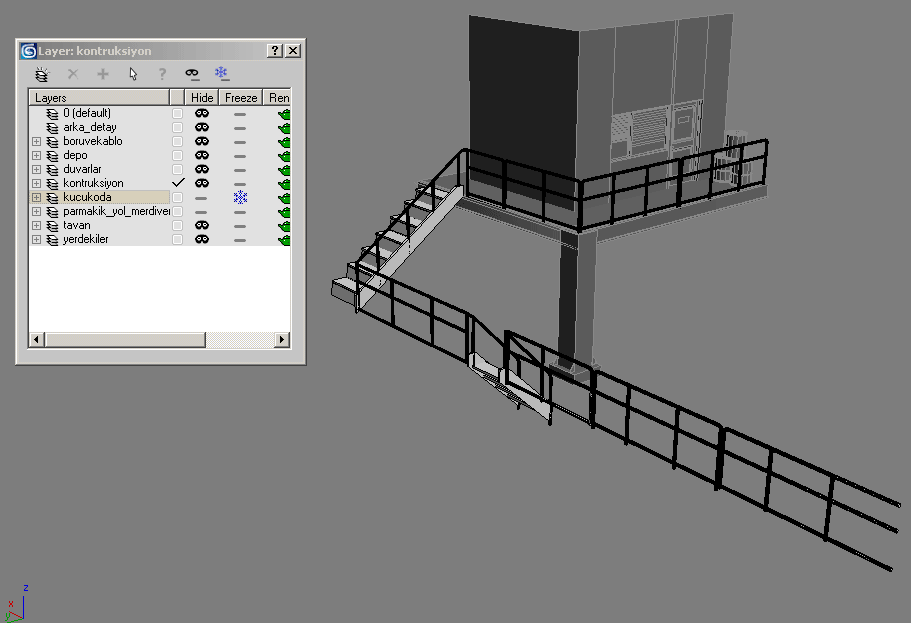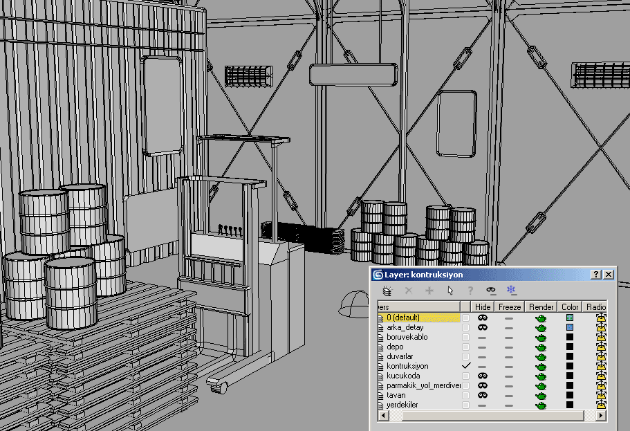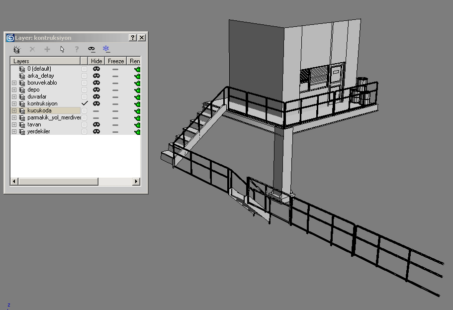Yukarıdaki şeklimizden örnek vermek gerekirse; depo bölümü, konstrüksüyonlar, küçük oda, tavan, merdivenler, yerdekiler, kablolar gibi layerlar oluşturdum. Modelleme aşamasından render çıktısın kadar her aşamada büyük faydalar sağlayacak olan layerlara ulaşım ve kullanımını 3dmax arayüzünden inceleyelim.